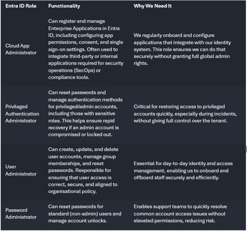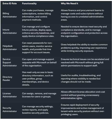 - Minimal GDAP: For CSP-only customers (no support plan with Intercept but just discount on Azure billing). Provides essential access for licensing, support tickets, and basic troubleshooting. Roles include: